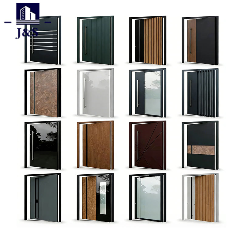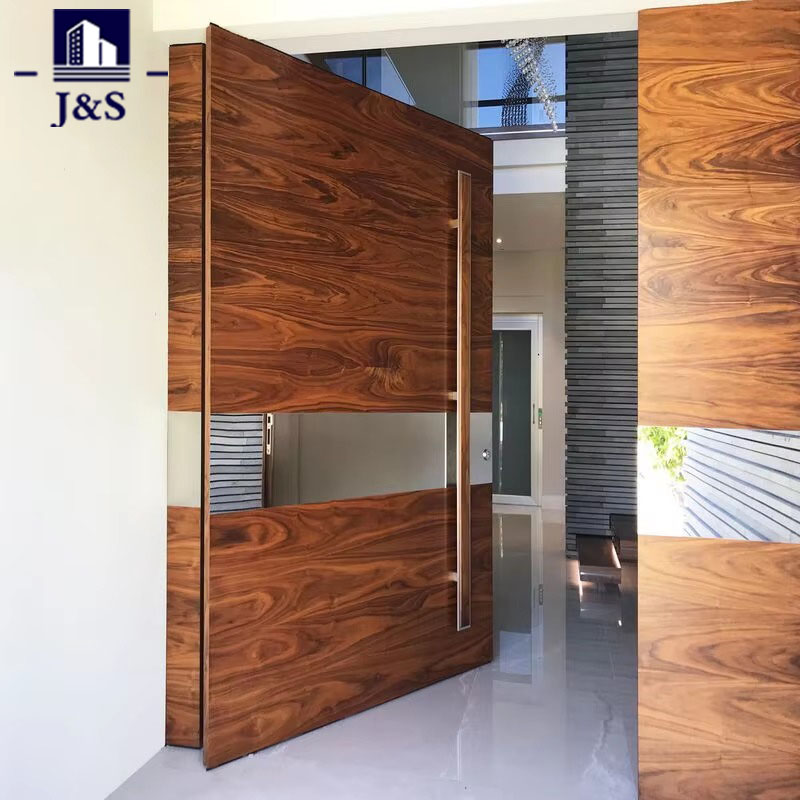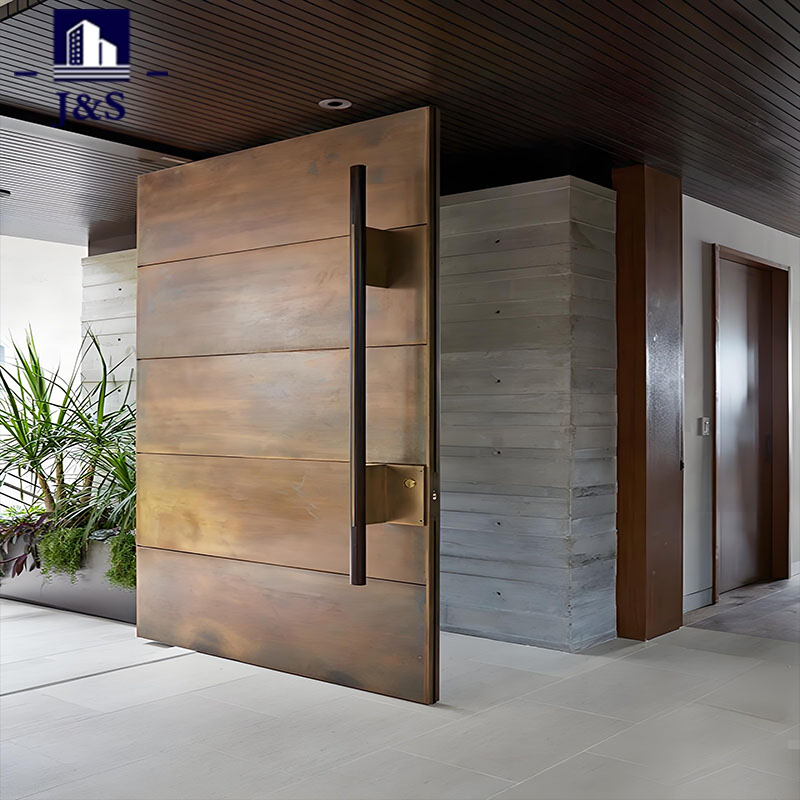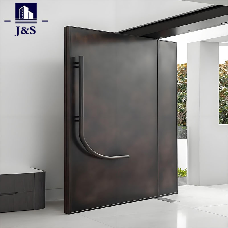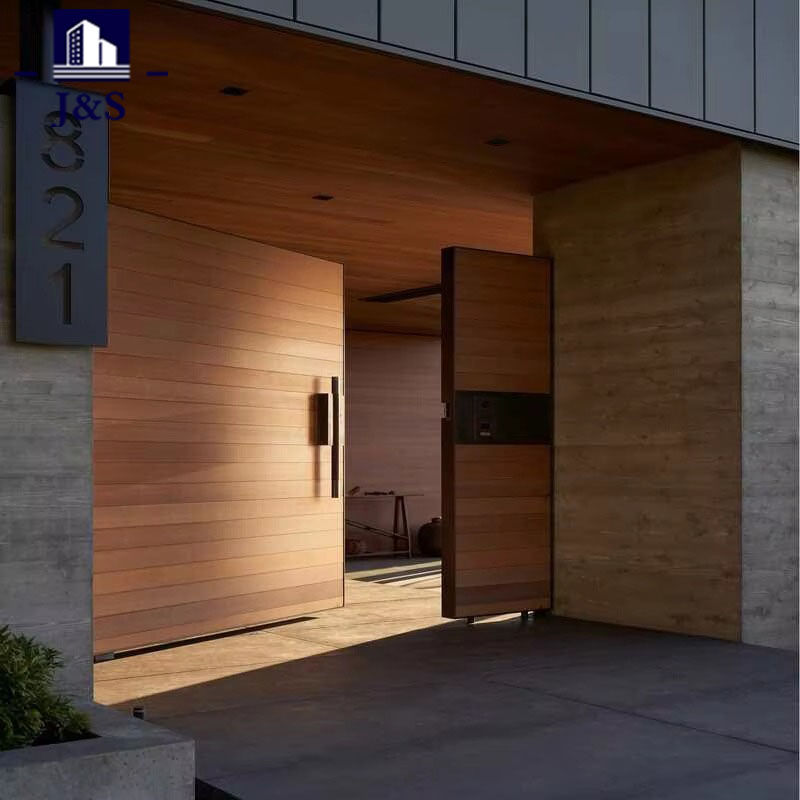 Il s'agit d'une porte extérieure de villa moderne en aluminium avec un design pivotant élégant, alliant esthétique minimaliste et fonctionnalité robuste. Fabriqué à partir d'aluminium de haute qualité avec une finition chaleureuse en grain de bois, il imite la texture naturelle du bois tout en conservant la durabilité, la résistance aux intempéries et le faible entretien de l'aluminium. Les larges panneaux horizontaux et la longue poignée verticale noire créent un look audacieux et contemporain idéal pour les villas de luxe. Sa charnière pivotante permet une ouverture fluide et sans effort, tandis que les panneaux latéraux en verre transparent assortis maximisent la lumière naturelle et relient l'intérieur au paysage extérieur. Légère mais solide, cette porte en aluminium offre une excellente sécurité contre les entrées forcées, une résistance à la corrosion et des performances à long terme, rehaussant parfaitement l'attrait extérieur des extérieurs résidentiels modernes.