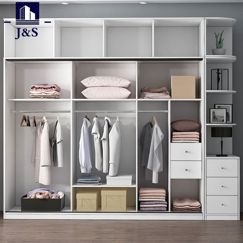 Nous fournissons un système de rangement pour vêtements avec étagères pour dressing, le blanc donne à votre chambre un nouveau look avec cette conception d'armoire à 4 portes. Bienvenue pour acheter une armoire de garde-robe coulissante en bois pour chambre simple chez nous.